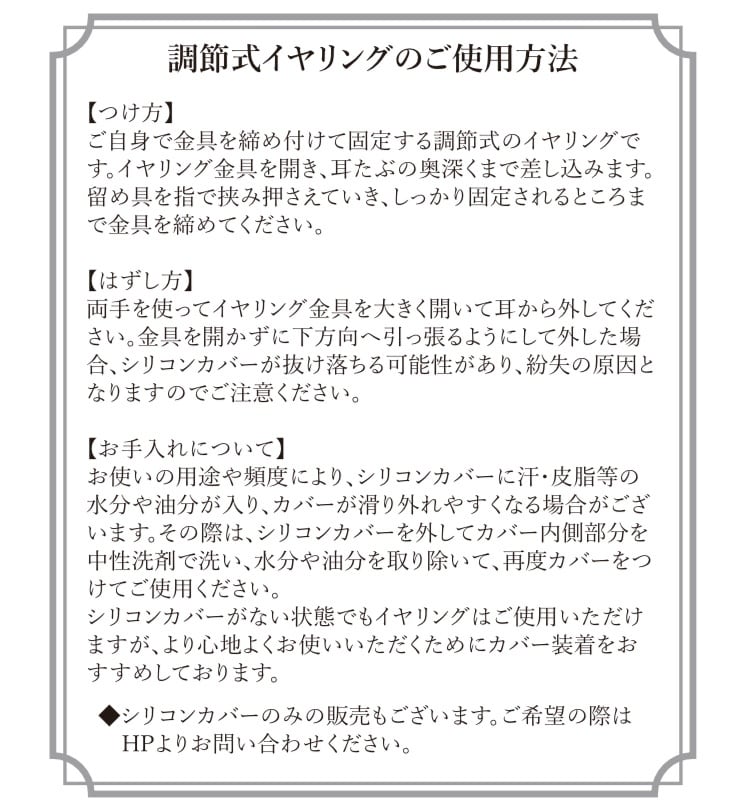 ※イヤリングは痛くなりにくく、外れにくい調節式留め具を使用しております。
