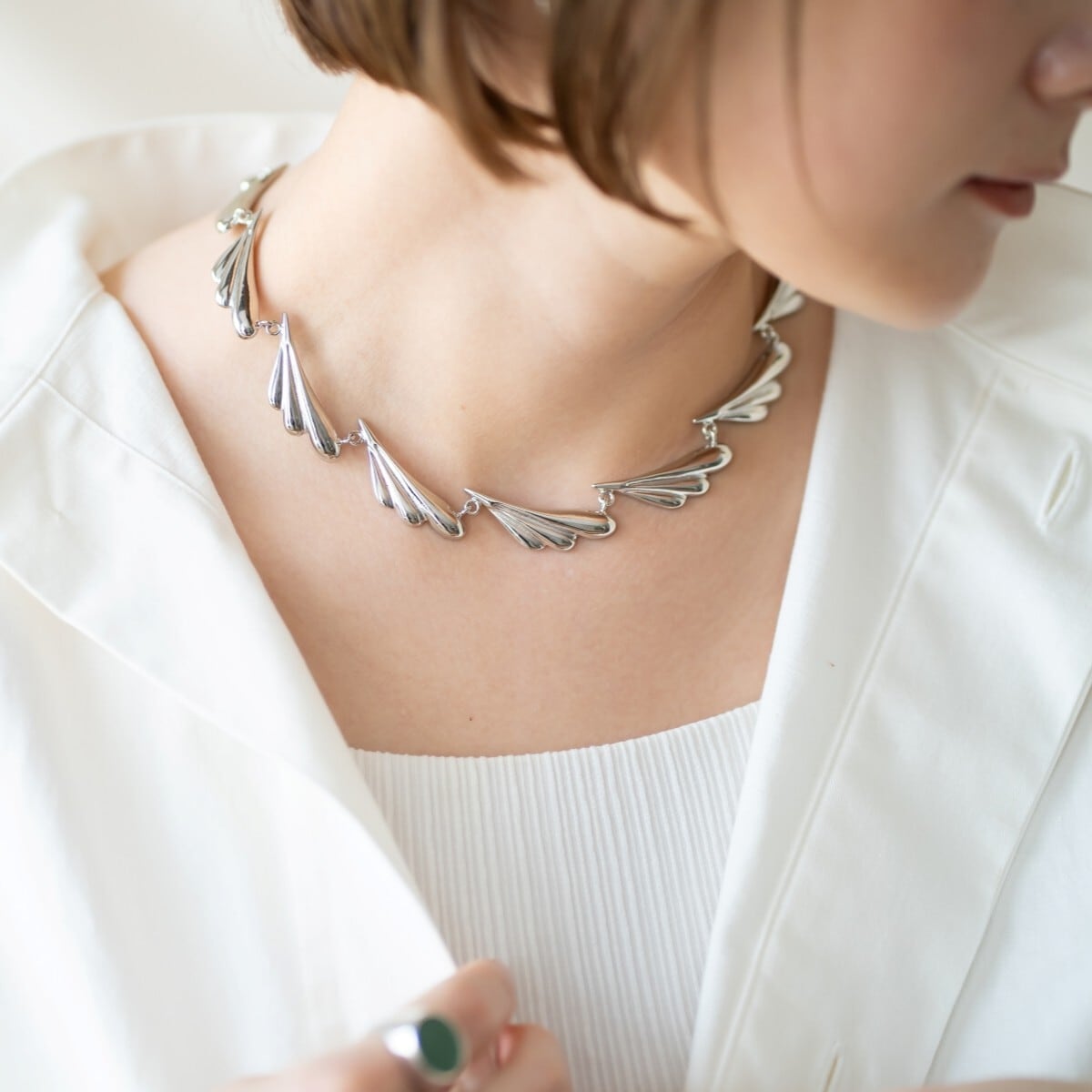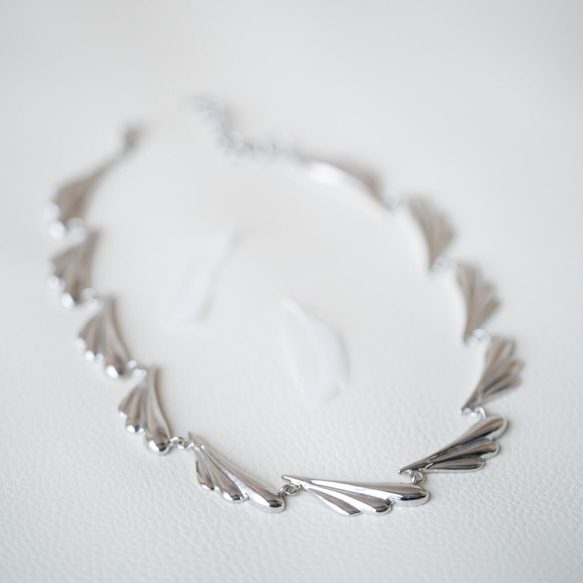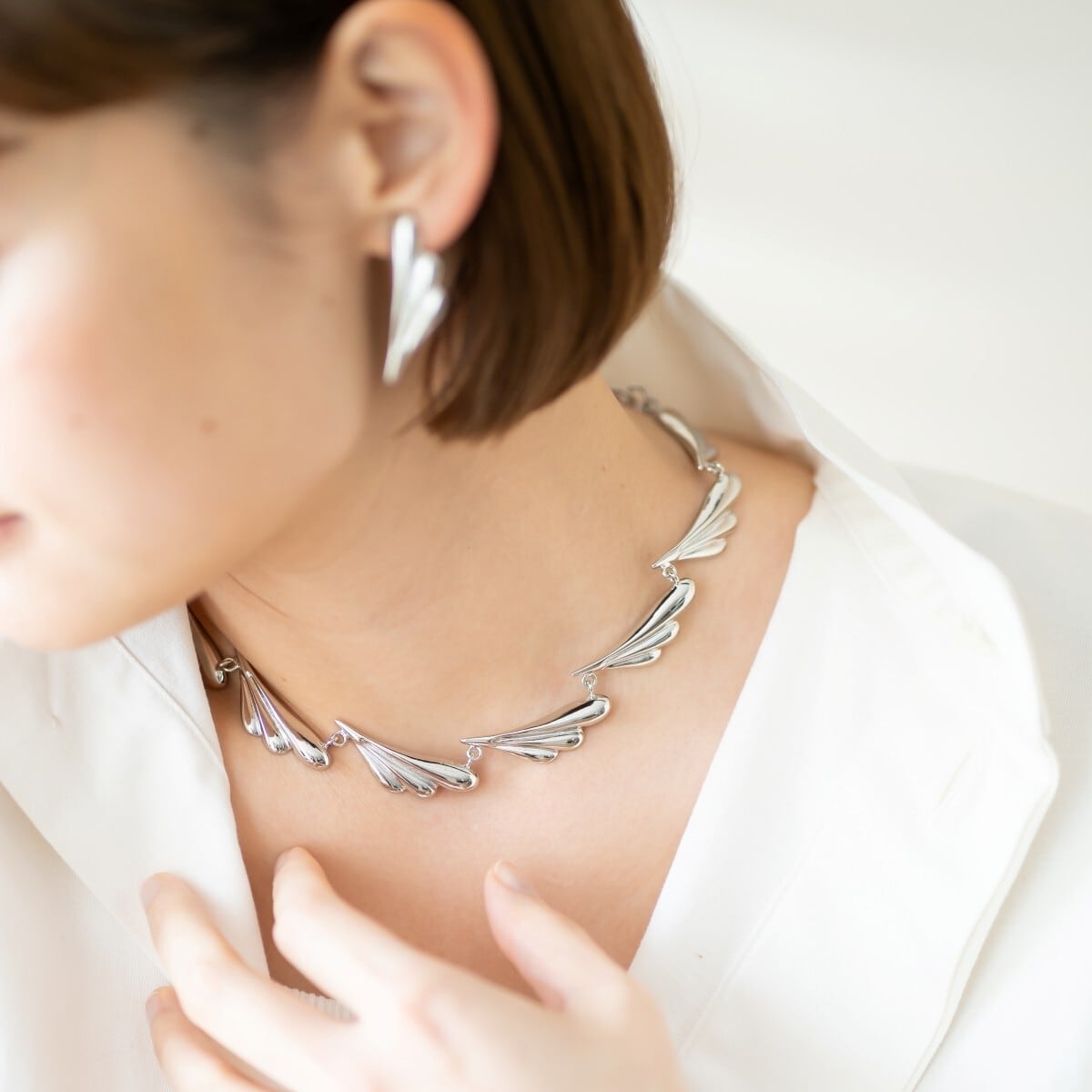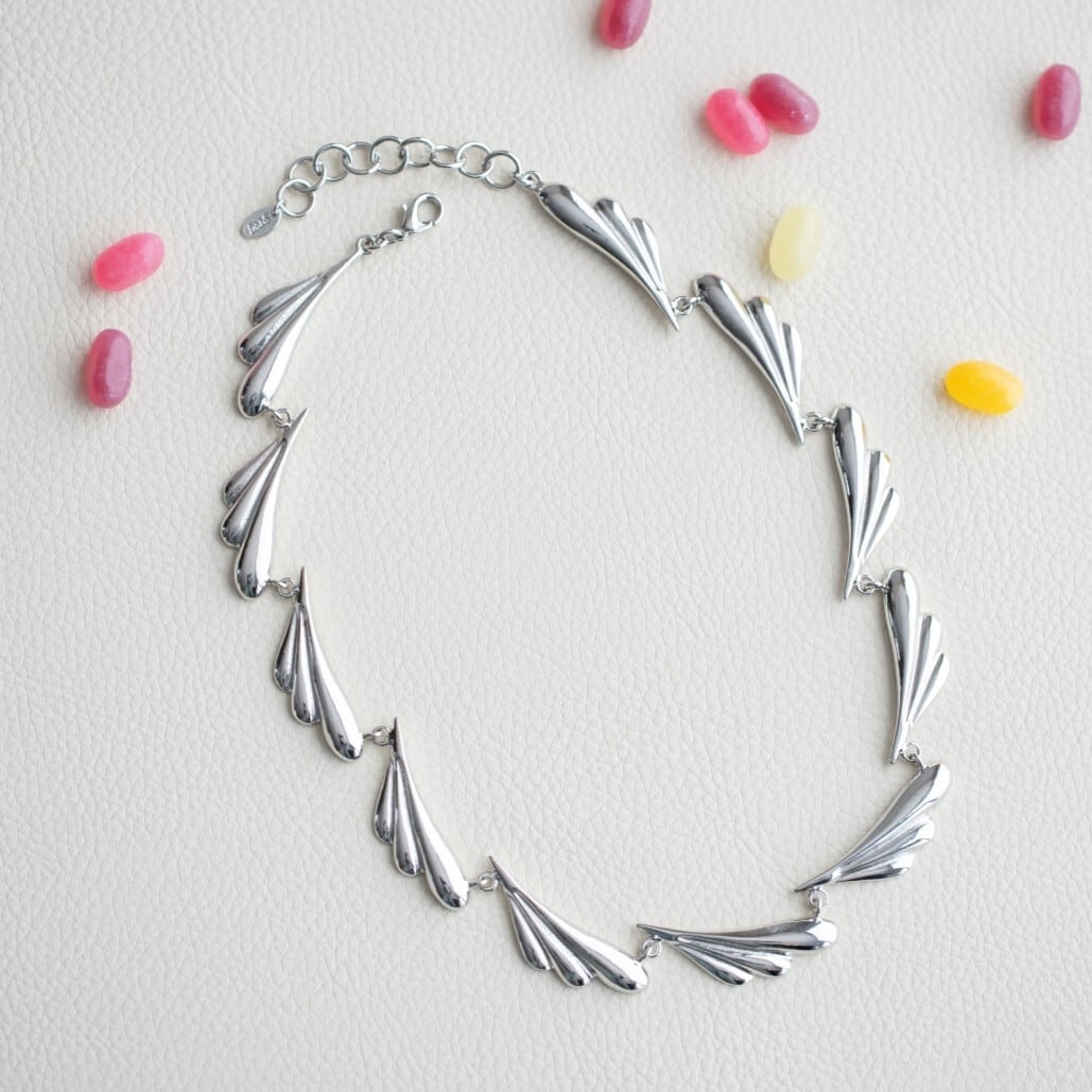 丸みとシャープさの両方を持ち合わせたフォルムの羽モチーフを連ねたネックレスは、まるで羽の虹がかかったような絶妙なバランスラインで、弧を描くように組み立てられています。